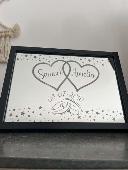 Offrez un cadeau unique et inoubliable avec ce miroir gravé personnalisé ! Parfait pour la Saint-Valentin, un anniversaire de mariage ou une déclaration d’amour, ce miroir élégant est gravé avec les prénoms des amoureux et leur date spéciale.
