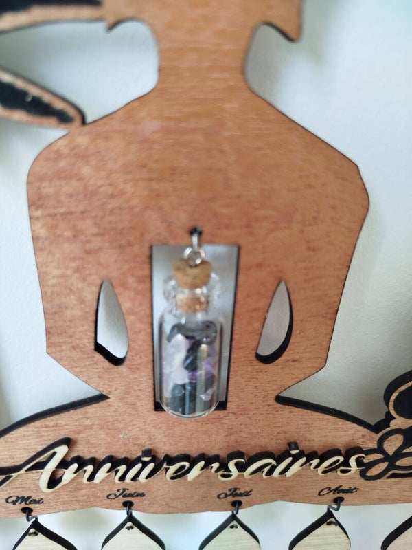 Ajoutez une touche zen et mystique à votre intérieur avec ce magnifique calendrier des anniversaires en bois. Gravé avec soin, il représente un Bouddha entouré d’éléments naturels et d’une fiole contenant des pierres protectrices choisies pour leurs énergies bienfaisantes :