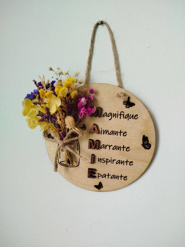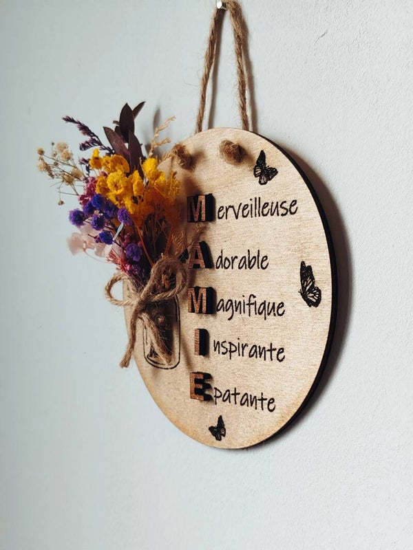Offrez un cadeau unique et rempli d'amour pour la fête des grands-mères avec cette magnifique plaque en bois gravée "MAMIE" et ornée d'un joli bouquet de fleurs séchées. Ce décor mural raffiné est un véritable hommage aux mamies merveilleuses, adorables et inspirantes.