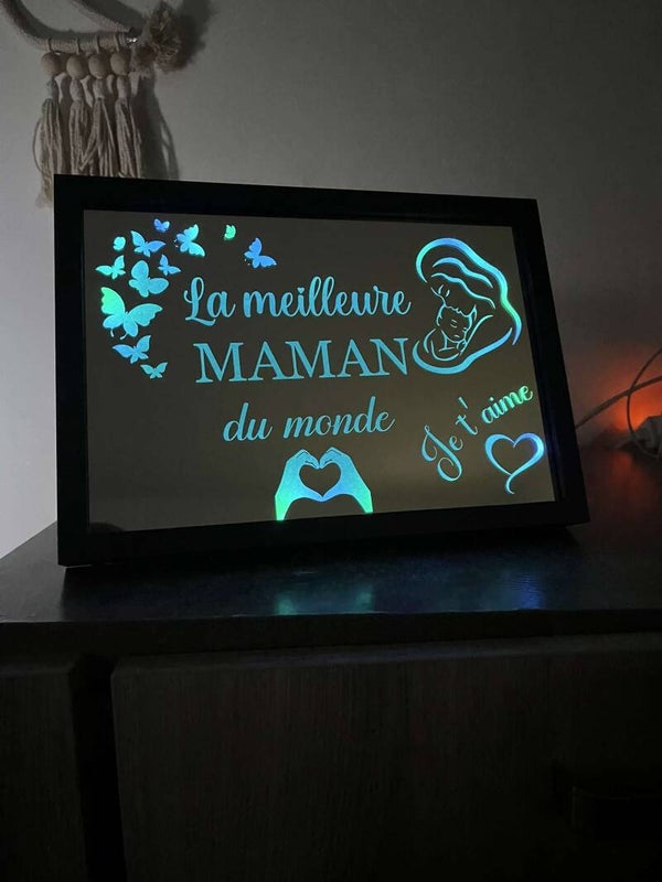 Illuminé par un éclairage LED multicolore, il affiche le doux message : "La meilleure MAMAN du monde – Je t’aime" accompagné de jolis motifs de papillons et de cœurs 🦋❤️
