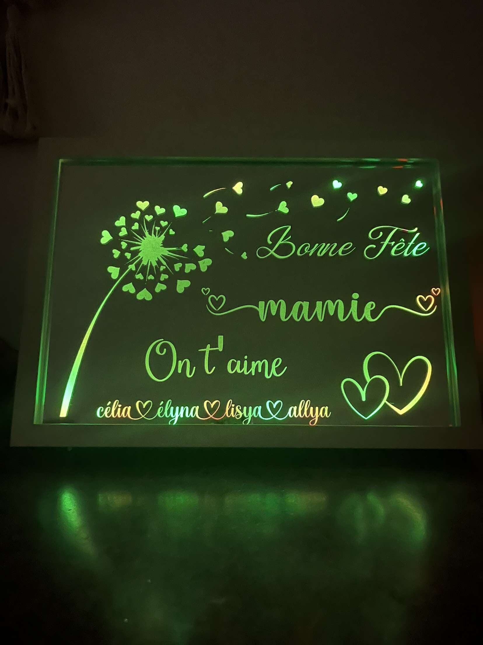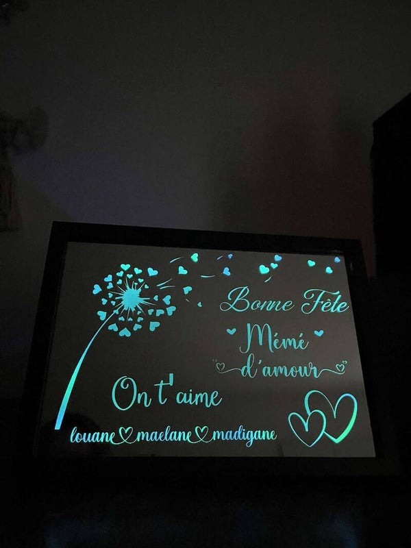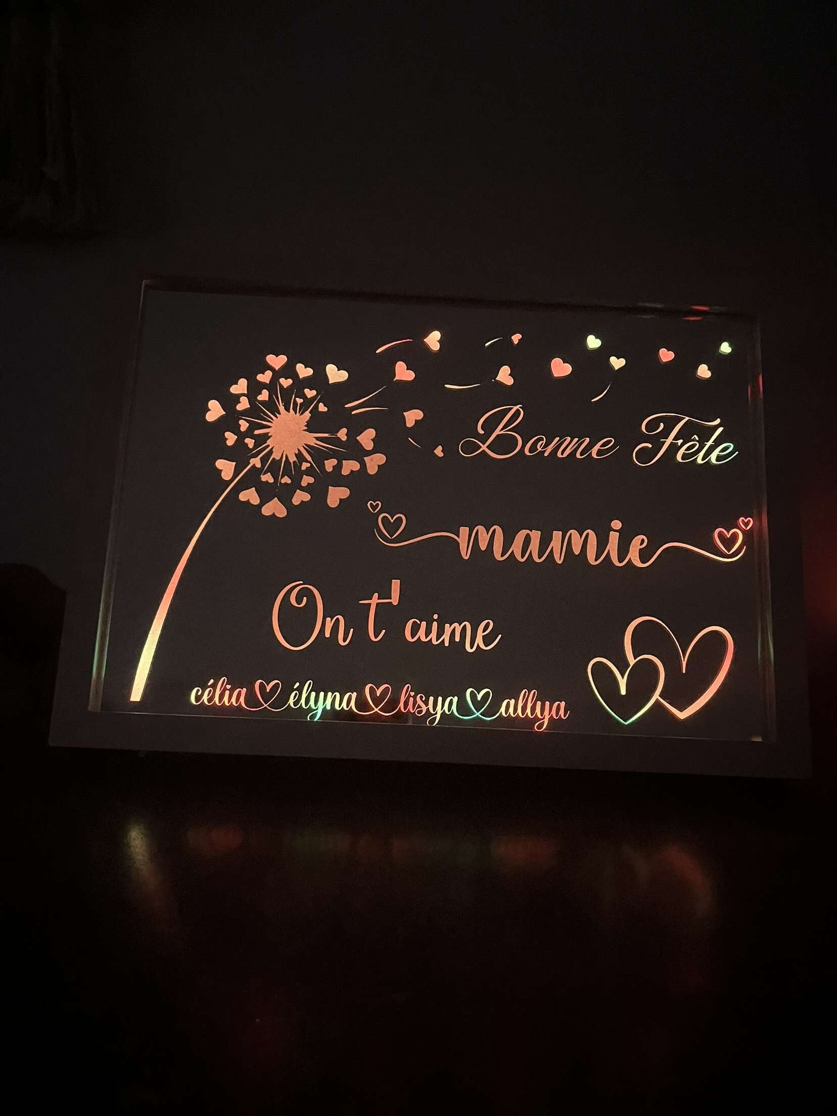 Offrez un cadeau unique et personnalisé à votre mamie pour sa fête avec ce magnifique miroir lumineux gravé. Ce miroir est doté d'un éclairage LED multicolore avec plusieurs modes de lumière, télécommande incluse.