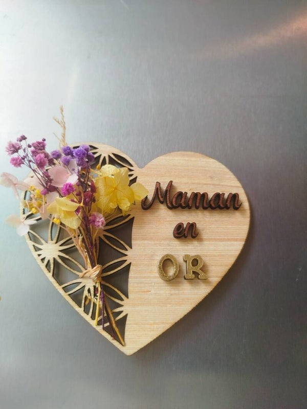 Offrez une touche de douceur et d’amour avec ce magnet en forme de cœur, gravé de l'inscription “Maman en Or”. Réalisé en bois naturel avec une découpe florale élégante, il est sublimé par un petit bouquet de fleurs séchées soigneusement fixé à la main.