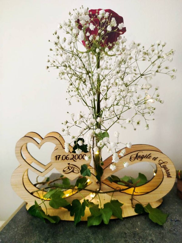 Offrez un cadeau unique et personnalisé pour célébrer un anniversaire de mariage. Ce support en bois naturel représentant le symbole de l'infini est gravé au laser avec les prénoms des mariés et leur date de mariage.