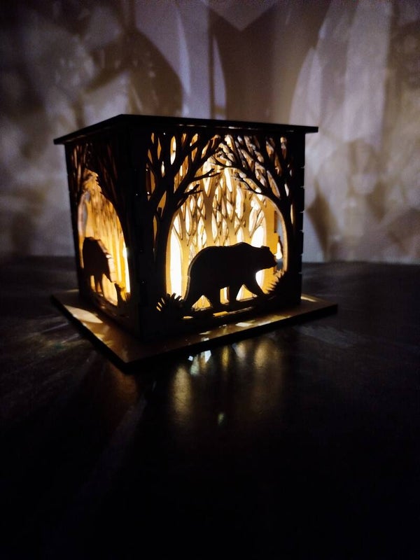 🌲 Plongez dans une ambiance chaleureuse et apaisante avec cette lanterne en bois découpée au laser, inspirée des forêts sauvages et de la magie de la nature.